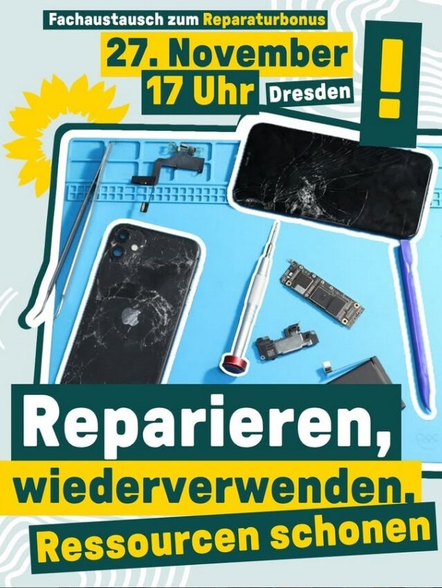 Wolfram Günther lädt am 27. November, von 17:00 bis 20:00 Uhr, zu einem Fachaustausch ins Volkshaus Cotta in Dresden ein. Im Mittelpunkt steht der Reparaturbonus und die Frage, wie wir Reparatur-Initiativen stärken können, um regionale Wertstoffkreisläufe nachhaltig zu fördern.