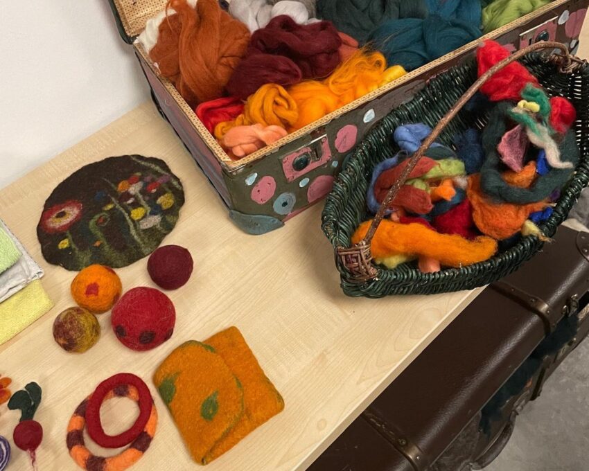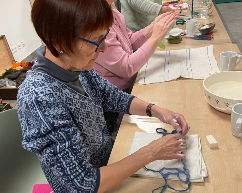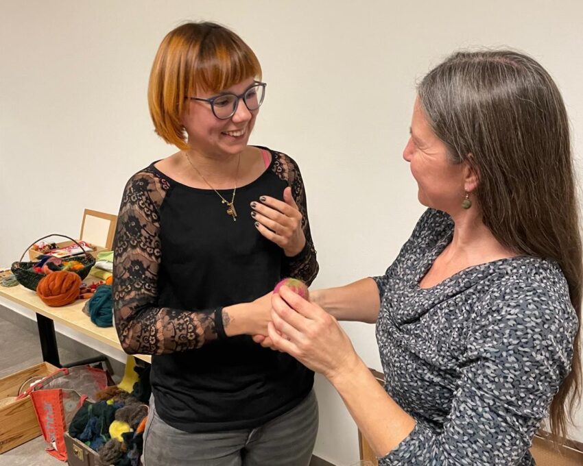 Unter der Anleitung von Jana Pistorius lernten die Teilnehmerinnen Schritt für Schritt, wie aus weicher Schafwolle, Wasser und Seife durch Reiben, Walken und Formen kleine Kunstwerke entstanden – von bunten Bällen über individuelle Armbänder bis hin zu praktischen Alltagsobjekten. Vorkenntnisse waren nicht nötig, nur Lust auf Kreativität und Freude am Ausprobieren.